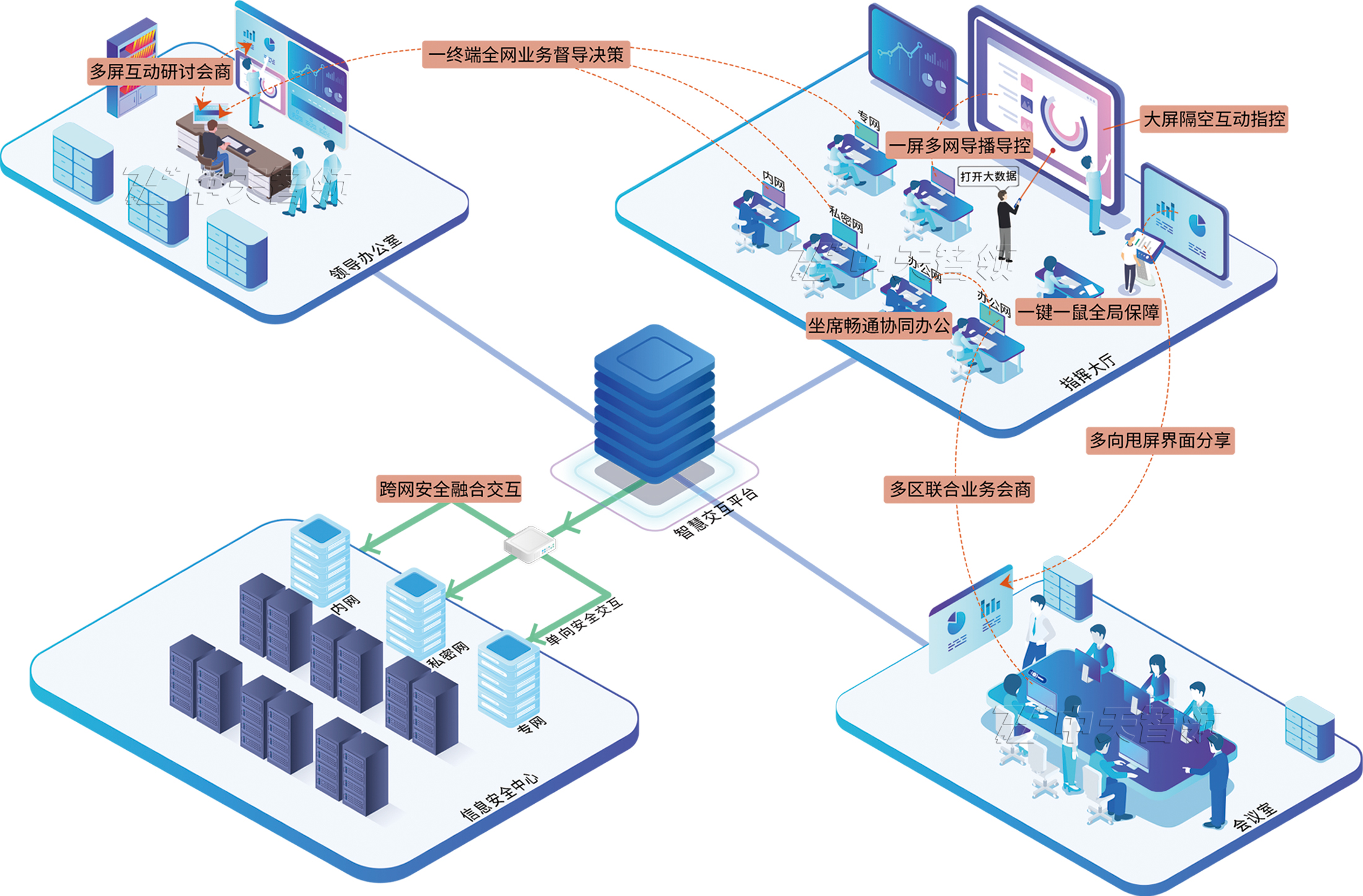 7、跨網(wǎng)安全融合交互:實現(xiàn)指令和視頻在相互隔絕的網(wǎng)絡信號間進行單向安全傳輸。