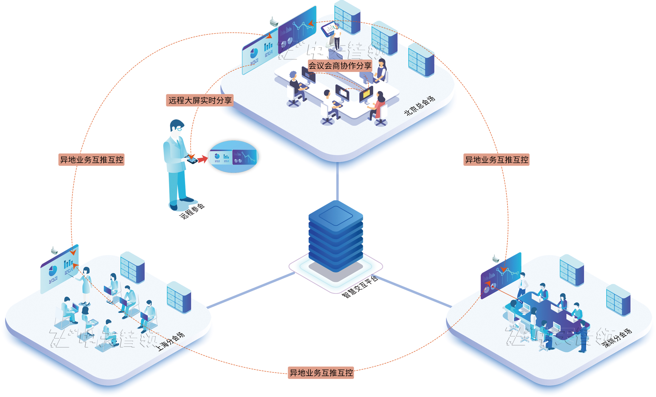 異地業(yè)務(wù)互推互控:可實現(xiàn)異地業(yè)務(wù)電子文件材料的審閱批注、多屏分發(fā),跨屏文檔協(xié)同、文檔傳輸、語音會議等功能。