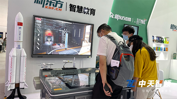 “智慧教育”在服貿會上也成為一大亮點,吸引了很多的現場參觀人員。包括北大智慧、新東方智慧教育、飛象智慧教育等。新東方智慧教育的航天交互體驗系統,通過手指在屏幕上的操作,實時互動呈現在大屏幕上,增強了趣味性和互動性。