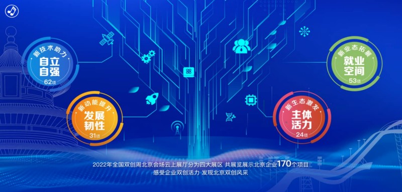 北京會場雙創周云展廳包含“新技術助力自立自強”、“新業態拓展就業空間”、“新動能提升發展韌性”、“新生態激發主體活力”4大組織主題展示區域,共展示創新創業項目170項。