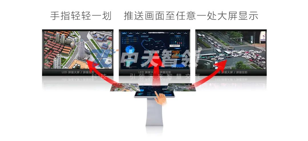在智能指揮臺屏幕上全屏顯示的需要操控的信號源終端的屏幕信息,推送至預設的任意其他顯示終端,即甩屏操作;最多支持八個方向的甩屏,通過在屏幕上向不同方向滑動手指,可將該信號源終端推送至預設的顯示終端或顯示終端上的預設位置。