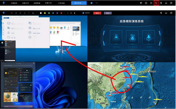智能指揮臺系統(tǒng)可以將不同的業(yè)務(wù)信號內(nèi)容快速的推送至電子沙盤、會議室屏幕、桌面觸摸屏、中心大屏等不同的顯示終端,被分享端可以直接使用多指觸摸、觸摸筆、智能激光遙控等方式控制該業(yè)務(wù)信號內(nèi)容。不同的用戶可以在多個區(qū)域的屏幕上進(jìn)行實(shí)時聯(lián)控,各個屏幕以信息共享的方式連接起來,充分滿足多人多區(qū)域聯(lián)合會議研討、實(shí)時跨屏幕業(yè)務(wù)界面互聯(lián)交流的使用需求。