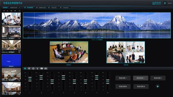 移動(dòng)可視化交互系統(tǒng):以自主創(chuàng)新的基于事件和動(dòng)作響應(yīng)的人機(jī)交互設(shè)計(jì)理念,通過平板電腦、手機(jī)等移動(dòng)設(shè)備實(shí)現(xiàn)小屏控制大屏,小屏決策并以毫秒級(jí)方式同步大屏顯示。支持一個(gè)移動(dòng)設(shè)備控制多屏組、多信號(hào)源,以及多個(gè)移動(dòng)設(shè)備分權(quán)限控制多屏組、多信號(hào)源和轉(zhuǎn)場(chǎng)控制,還具備環(huán)境管理功能,可對(duì)設(shè)備如拼控、矩陣等,以及指揮大廳或控制室外圍設(shè)備如燈光、窗簾、音響、供電等進(jìn)行控制。