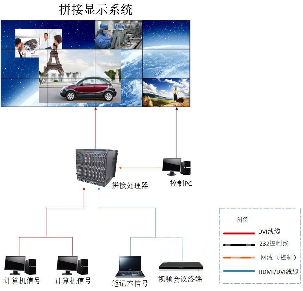 各類(lèi)信號(hào)混合顯示,可將各種信號(hào)源窗口、視頻信號(hào)在大屏幕上混合顯示,PC信號(hào)、監(jiān)控信號(hào)、視頻信號(hào)等均能夠以窗口方式任意位置擺放、縮放、漫游、疊加、整屏等顯示出來(lái)。