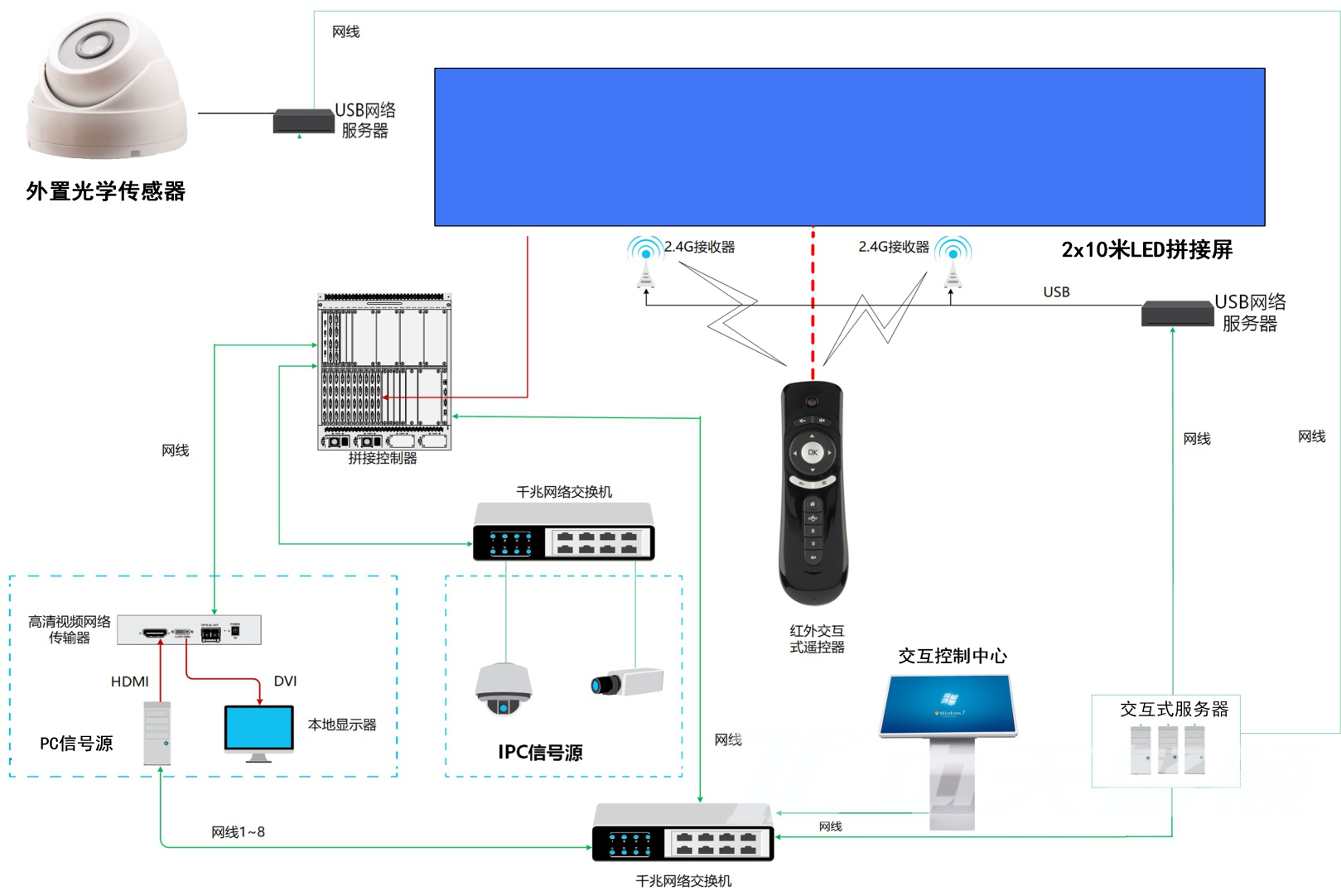 本項(xiàng)目共計(jì)2x10米LED屏幕、智能協(xié)同互動(dòng)系統(tǒng)2大部分組成。共設(shè)計(jì)外置5套光學(xué)傳感器,傳感器用來(lái)捕捉箱體畫(huà)面,通過(guò)圖像處理技術(shù)進(jìn)行座標(biāo)化運(yùn)算,然后通過(guò)USB服務(wù)器轉(zhuǎn)換成網(wǎng)絡(luò)信號(hào)傳輸?shù)浇换ゼ悍?wù)器上。最后由智能筆激光指示器打出激光點(diǎn),光學(xué)傳感器捕捉光點(diǎn)位置后,再由服務(wù)器集群基于網(wǎng)絡(luò)向相應(yīng)的信號(hào)源發(fā)送交互控制信令,實(shí)現(xiàn)對(duì)大屏幕的交互操作。其中交互控制中心的內(nèi)置協(xié)同互動(dòng)軟件,可支持雙屏聯(lián)動(dòng)、信號(hào)布局、信號(hào)切換、信號(hào)漫游、信號(hào)調(diào)整等功能。