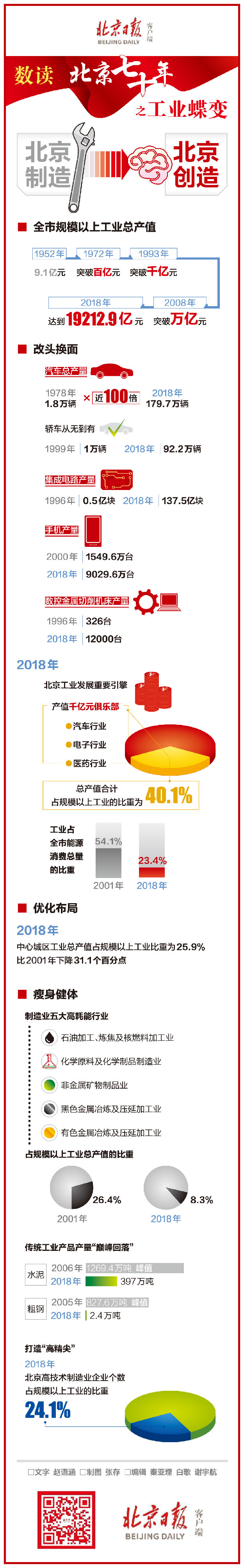 從新中國(guó)成立初期工業(yè)總產(chǎn)值僅9.1億元到一步步突破百億、千億、萬(wàn)億元;從化工、冶金等傳統(tǒng)工業(yè),逐步轉(zhuǎn)向汽車、電子、醫(yī)藥等現(xiàn)代工業(yè)……市統(tǒng)計(jì)局日前發(fā)布新中國(guó)成立70周年北京工業(yè)發(fā)展綜述,北京不僅在工業(yè)化進(jìn)程上取得輝煌成就,更從高速發(fā)展逐步轉(zhuǎn)向高質(zhì)量發(fā)展。特別是2014年以來,北京工業(yè)加快步入由“北京制造”向“北京創(chuàng)造”的蝶變新階段,不斷煥發(fā)出新的活力。