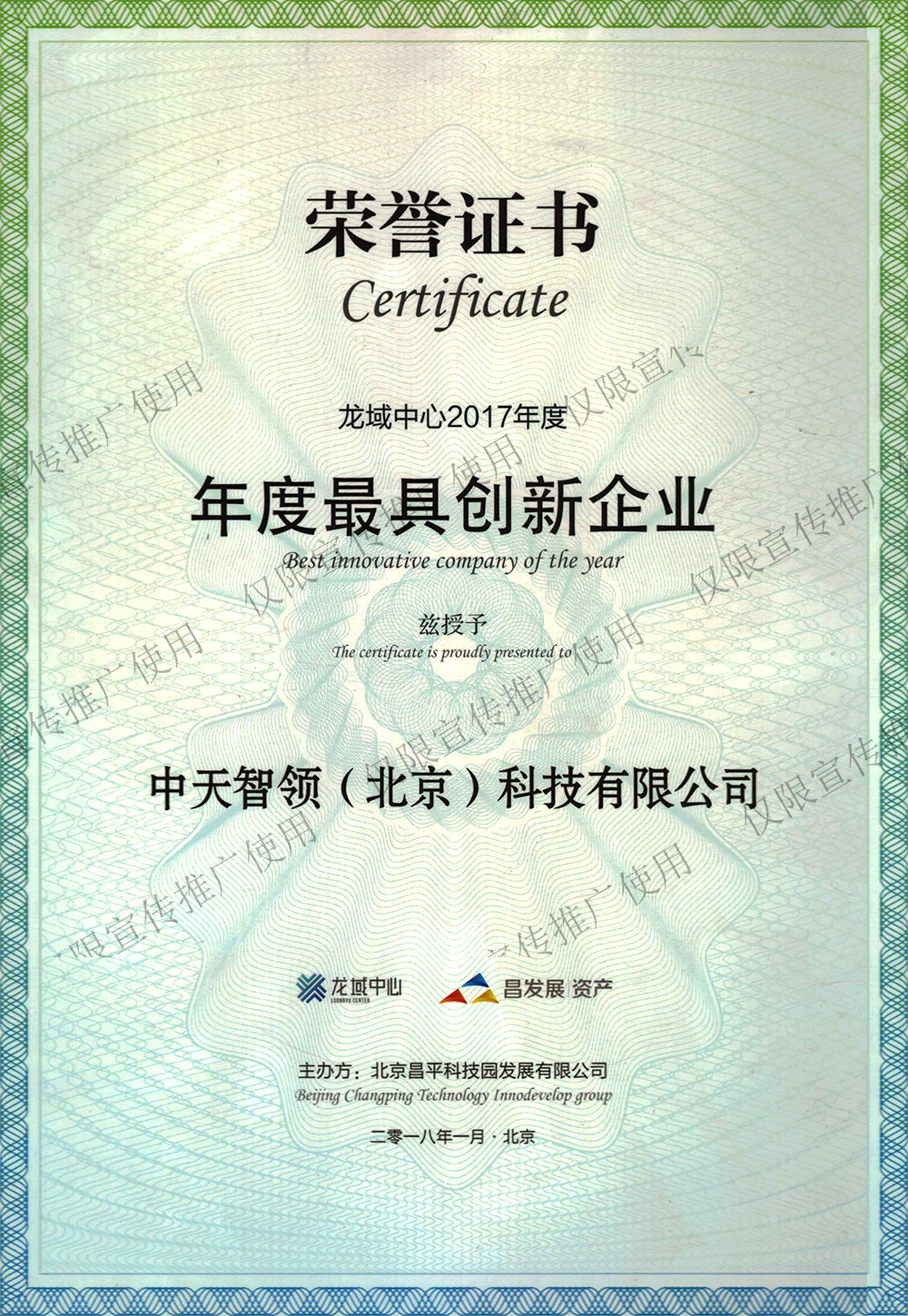 [資質(zhì)展示]龍域中心2017年度最具創(chuàng)新企業(yè)榮譽(yù)證書(shū)