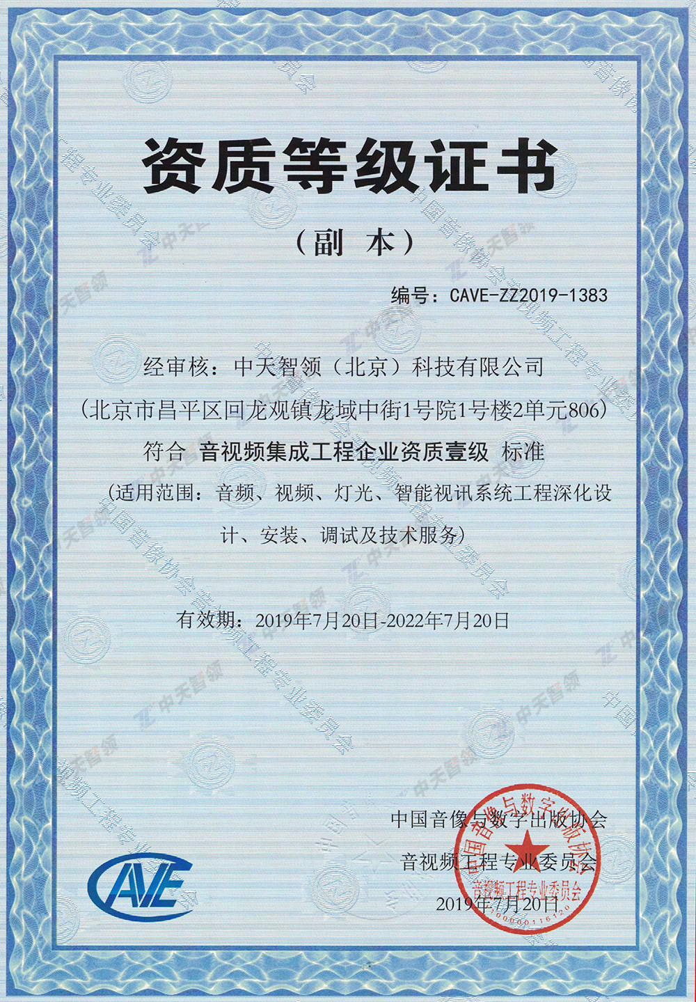 [資質(zhì)展示]音視頻集成工程企業(yè)資質(zhì)壹級(jí)資質(zhì)等級(jí)等級(jí)證書