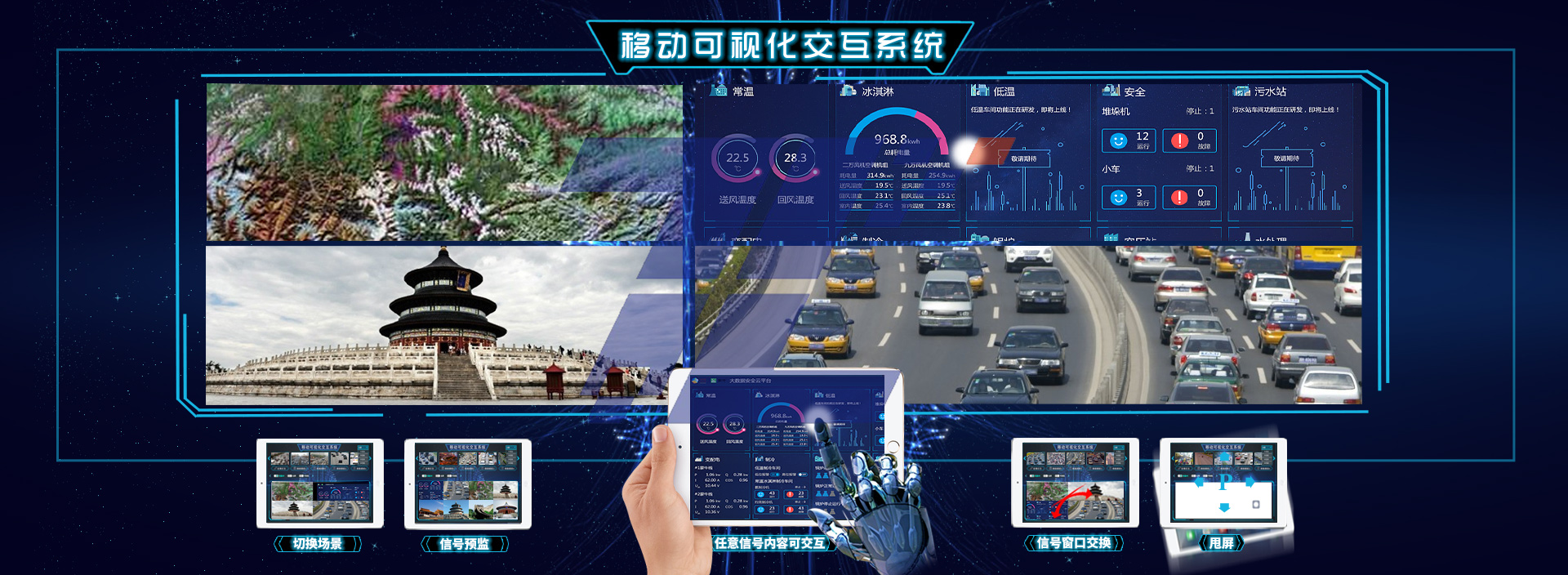 互系統(tǒng)級觸控系統(tǒng)、智慧交互手勢識別系統(tǒng)、大屏KVM管控系統(tǒng)、云享控系統(tǒng)、智慧交互電子沙盤、聯(lián)合標繪、實物交互等。