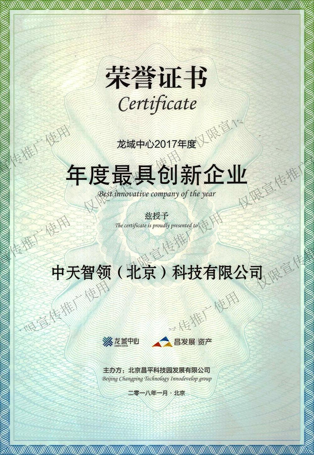 [資質(zhì)展示]龍域中心2017年度最具創(chuàng)新企業(yè)榮譽(yù)證書